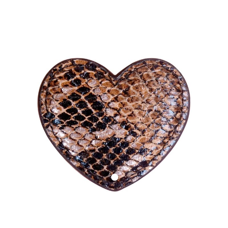 Clip en forme de coeur effet imitation peau de serpent. À fixer sur le rabat grâce à un système de clip sécurisé : à l'arrière du clip se trouvent 2 têtes en métal à insérer dans les 2 oeillets du rabat. Scellez la position du clip grâce aux 2 vis fournies et ça y est, votre clip est parfaitement fixé et ne pourra pas se décrocher ! Changez-le au gré de vos envies et de vos looks.