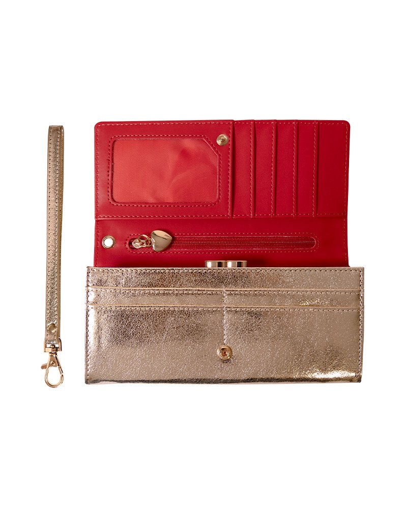 Portefeuille doré brillant (effet feuille d'or), intérieur rouge.