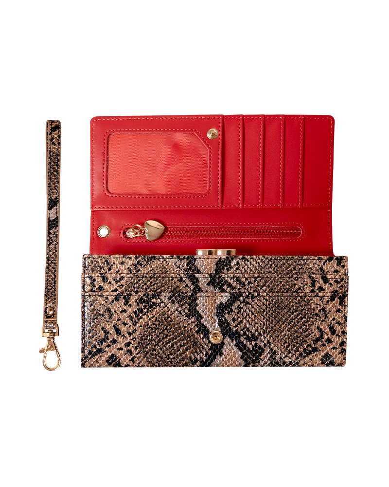 Portefeuille imitation serpent, intérieur rouge.